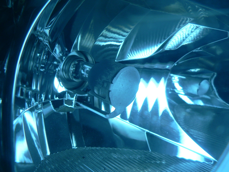 A parabolatükör belsejében, az izzó végénél van egy kis fényterelő kupak. Ahogy kivettem a régi égőt, az egyik megmozdult. Először észre sem vettem betetem az új izzót, majd jött a meglepetés, hogy összevissza szór a lámpa, nincs a fénynyalábnak éles határa.